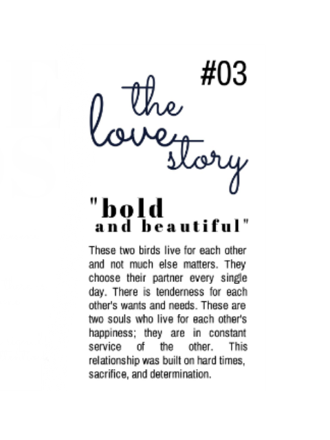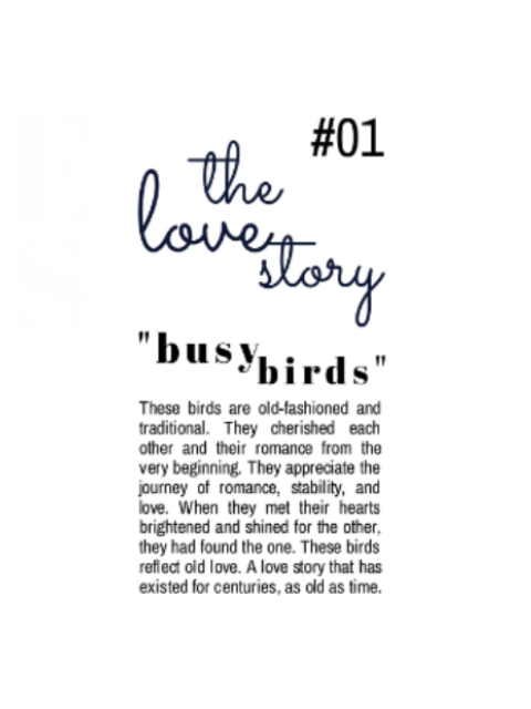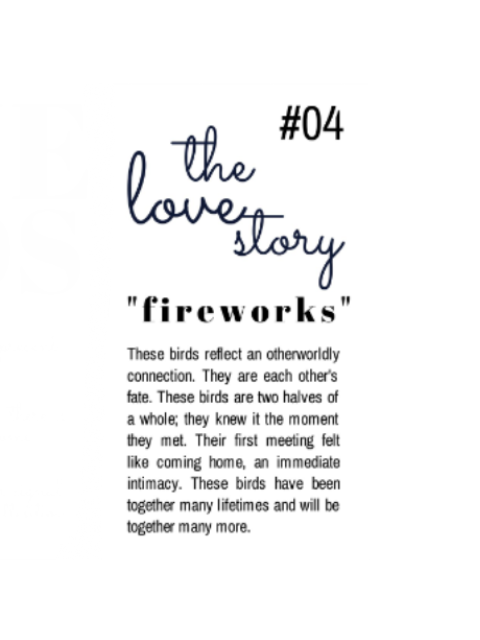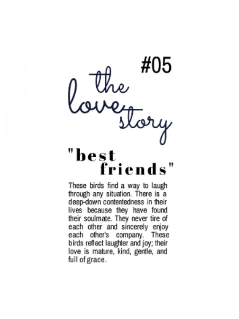 Love Birds #01 "Busy Birds" $45.00 Sold out Love Birds #02 "Big Personalities" $45.00 Sold out Love Birds #03 "Bold and Beautiful" $45.00 Sold out Love Birds #04 "Fireworks" $45.00 Sold out Love Birds #05 "Best Friends" $45.00 Sold out Love Birds #06 "Destiny" $45.00 Sold out Love Birds #07 "Courtship" $45.00 Sold out